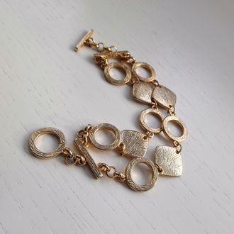 Винтажный браслет из сплава с покрытием под золото, звенья украшены рельефными узорами, имитирующими древесину.