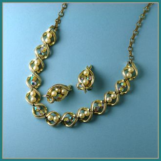 Винтажный комплект Coro из колье и клипс (без маркировки, есть характерная подвеска на конце колье). Сплав с покрытием под светлое золото, вставки - искусственные жемчужины и кристаллы с эффектом северного сияния (aurora borealis). Комплект имеет следы естественного износа (потёртости покрытия и на жемчужинах.