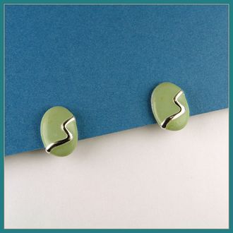 Винтажные клипсы из сплава с покрытием под платину, декорированы эмалью пастельного серо-зелёного цвета.