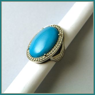 Крупное коктейльное кольцо из сплава с покрытием под серебро. Крупный овальный кабошон бирюзового цвета сделан из художественного стекла.