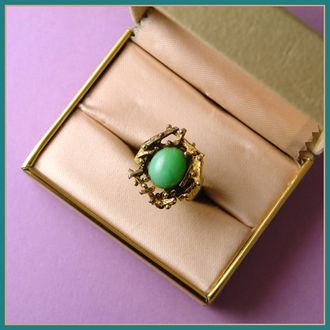 Винтажное кольцо из сплава с покрытием под золото с эффектом чернения. Абстрактный декор украшен кабошоном из художественного стекла молочно-зелёного цвета. Кольцо не маркировано, есть лёгкие следы естественного износа, 1960-70-е гг., США.