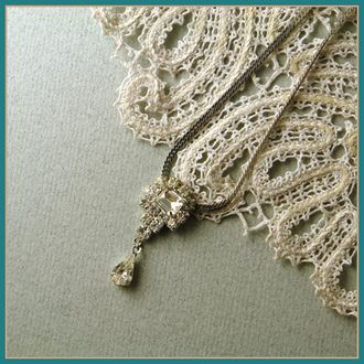 Ощутите трепетное очарование винтажных украшений, взяв в руки это нежное колье... Сплав с покрытием под серебро, изящная подвеска на цепочке плоского плетения декорирована прозрачными мерцающими кристаллами. Прелестная вещица!