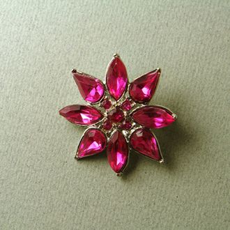 Яркими бликами цвета фуксии переливается эта небольшая, но видная брошка из сплава с покрытием под серебро. Крупные кристаллы сделаны из цветного пластика, кристаллы поменьше - из стекла. Брошь в отличном состоянии, не маркирована, современная, привезена из США.