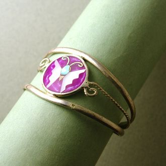 Узнаваемый мексиканский винтажный браслет ручной работы. Сплав с покрытием серебром (альпака). Браслет декорирован заливной эмалью и натуральным перламутром. Симпатичная бабочка расположена на розовом фоне, есть похожий браслет с чёрным фоном. Рассчитан на тонкое запястье. Маркировка - ALРACA MEXICO, 1960-70-е гг.