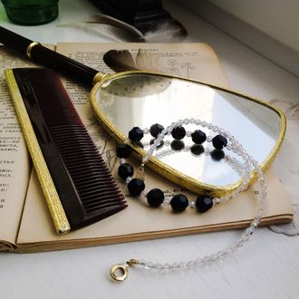 Эти бусы достаточно просты по дизайну, при этом они неуловимо очаровывают. :) Сделаны из стекляннух бусин - прозрачных и чёрных. Бусины поменьше имеют лёгкий эффект северного сияния (aurora borealis). На застёжке есть отметка о патенте, она очень удобная и надёжная! Точный возраст бус не известен, привезены из США.