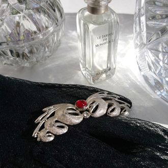 Эту чарующую винтажную брошь я бы сравнила со стихотворением - так поэтично расходятся декоративные элементы дизайна, словно нежная рифма! :) Сплав с покрытием под серебро (чеканка), центр броши украшен кабошон алого цвета и прозрачным кристаллом. Брошь достаточно лёгкая, хорошо удержится даже на изящных тканях.