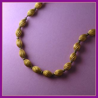 Эти красивые винитажные бусы не маркированы, вместе с тем, сделаны с такой любовью, что очень хотелось бы узнать имя мастера или марки, которая их выпустила в далёкие 1960-е гг. Полые золотистые бусины сделаны из брашированного металла. Перемежаются с маленькими фигурными бусинами. В каждой детали отражается кропотливый подход автора, например, для особой прочности колье собрано на металлическую цепочку. Даже колечки на застёжке имеют браширование! В общем, рассматривать эти бусы - удовольствие, носить их - наслаждение, поверьте! ;) Бусы привезены из США, есть несколько крапинок патины и следы лёгкого естественного износа, в целом же украшение в хорошем состоянии.