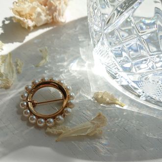 Эта милая малышка хорошо будет смотреться в паре с другой брошкой золотого цвета или с ниткой жемчуга на шее... Сплав с покрытием под золото (похоже на позолоту), искусственные жемчужины собраны на проволоку золотого цвета. Брошечка хорошо сохранилась, не маркирована, 1970-е гг., США.