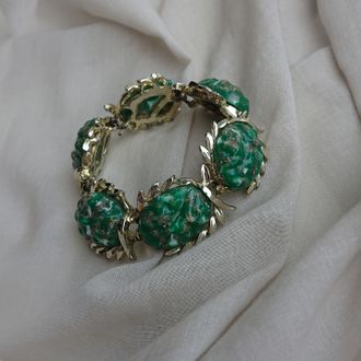 Этот увесистый, шикарный винтажный браслет не похож на современные украшения и в этом его особая прелесть. Крупные рельефные кабошоны (люцит) вставлены в ажурные рамки, из легко принять за драгоценные камни! Сплав с покрытием под глянцевое светлое золото, на тыльной стороне покрытие имеет следы износа (это характерная черта все украшений, исполненных в этой технике), в целом же браслет выглядит превосходно. Если вас не пугают следы времени, он станет вашим верным красивым спутником. :) Не маркирован, 1960-е гг., США.